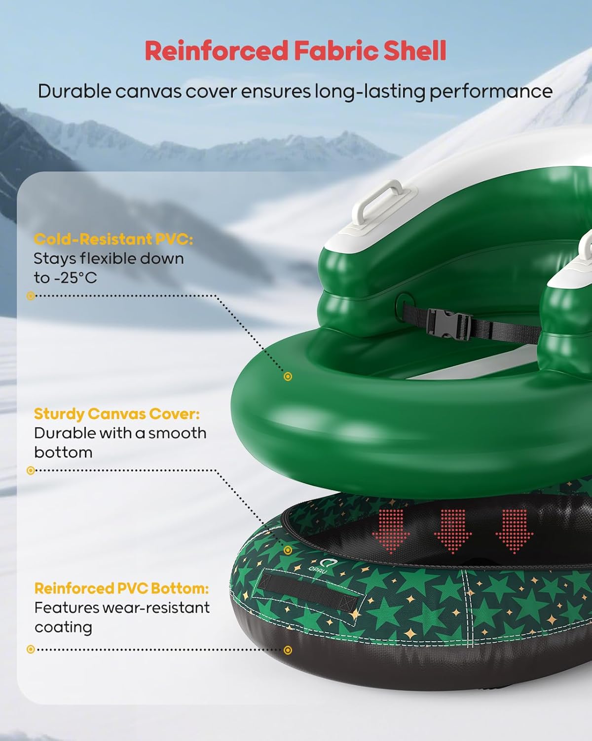 • 💪 Durable Canvas, Built to Last – Reinforced fabric cover resists scratches from ice and snow, protecting the inflatable layer inside. More durable than ordinary snow tubes, this air sled is ready for winter after winter.