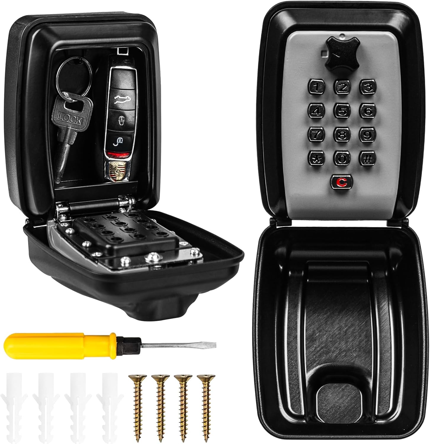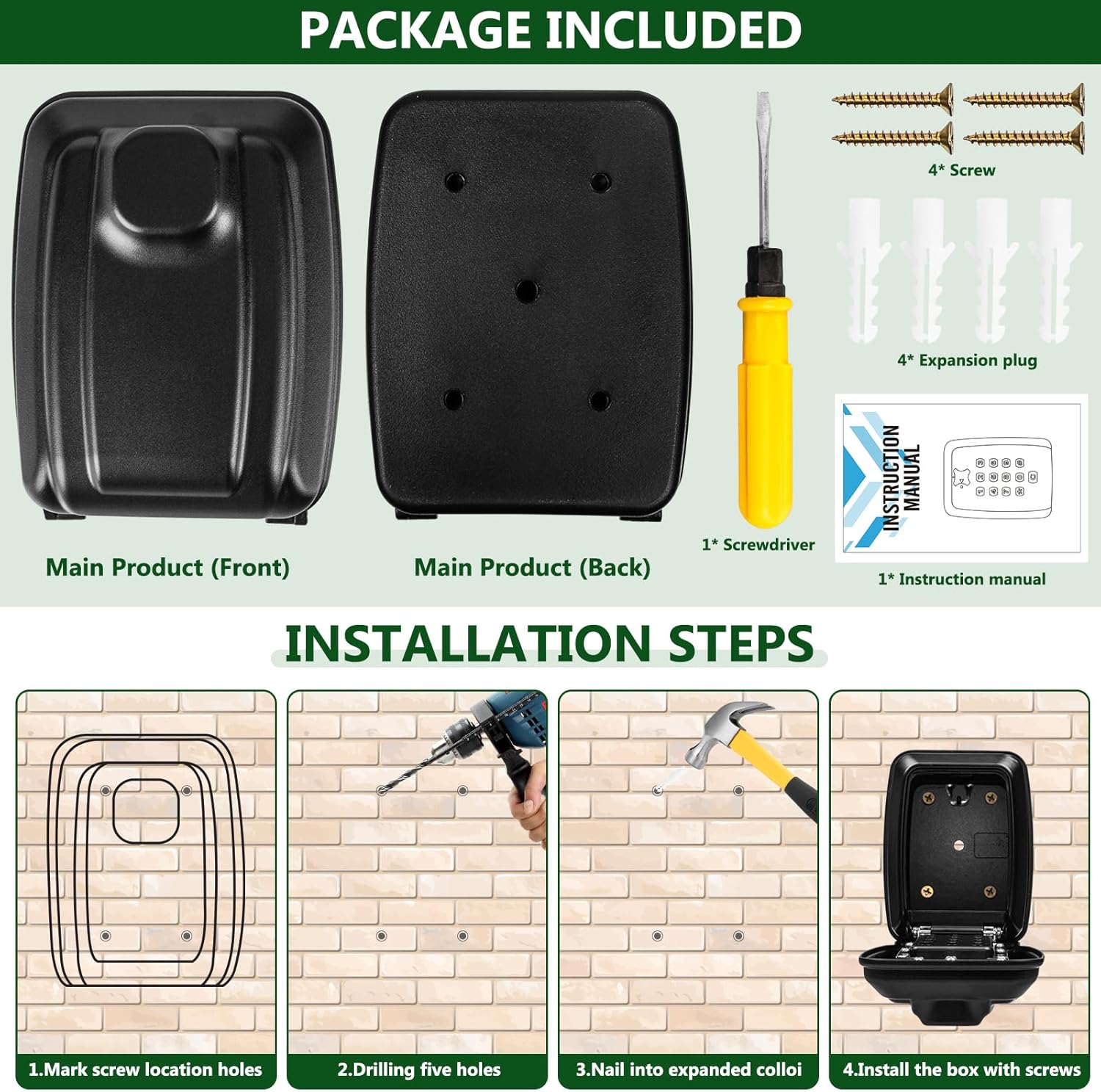 - 【Easy To Install】The outdoor key safe wall mounted comes with all necessary installation components, includes a secure key box, 1 instructions , screwdriver and mounting kit (4 screws + 4 expansion plugs). Easy installation,even easy to install for a non DIY person.