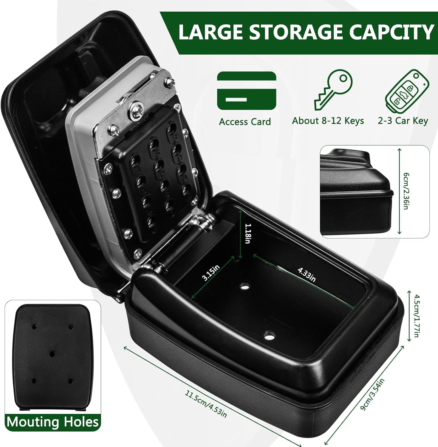 - 【Large Capacity】Our keybox provides ample and highly secure interior storage space for your valuables. The key safe wall mounted can hold up to 5-8 medium-sized house keys, access cards, car keys and other small objects. The lock box provide easy and secure acess to your spare keys, and give easy access to care takers and home workers. Its versatile design suits various scenarios, be it for homes, vehicles, rental properties, or commercial spaces.